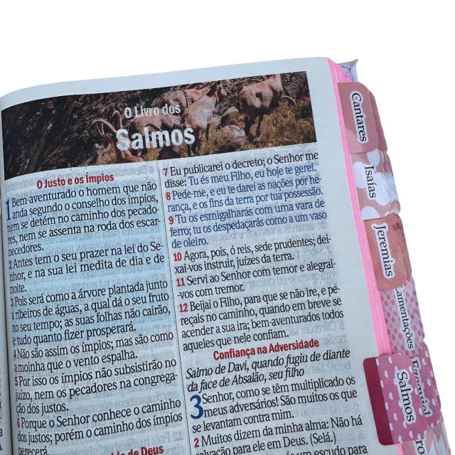 A Bíblia vai com as Abas adesivas aplicadas para auxiliar na procura dos livros